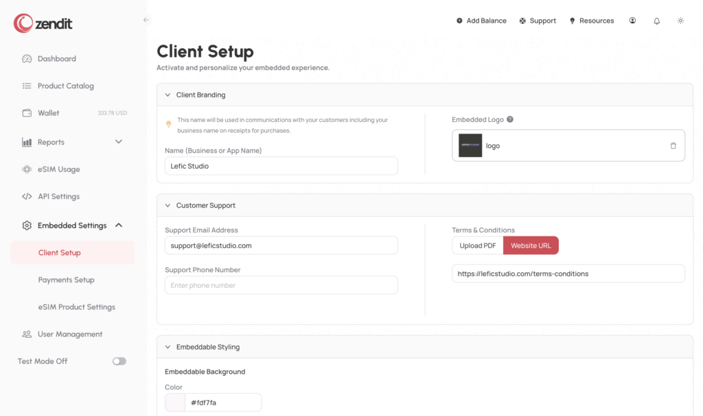 In the customer support section, an email address is required for customers to contact you for support. If you need a hand for customer issues you can’t answer yourself, you can always escalate questions to zendit’s support team to help you support your customers.